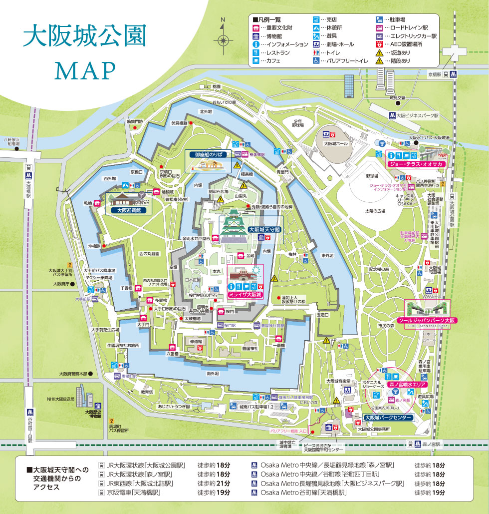 大阪城公園は、最寄り駅がたくさんあり、利用する駅によって公園の入り口が変わってくるため、用途に合わせて選ぶ必要があります。